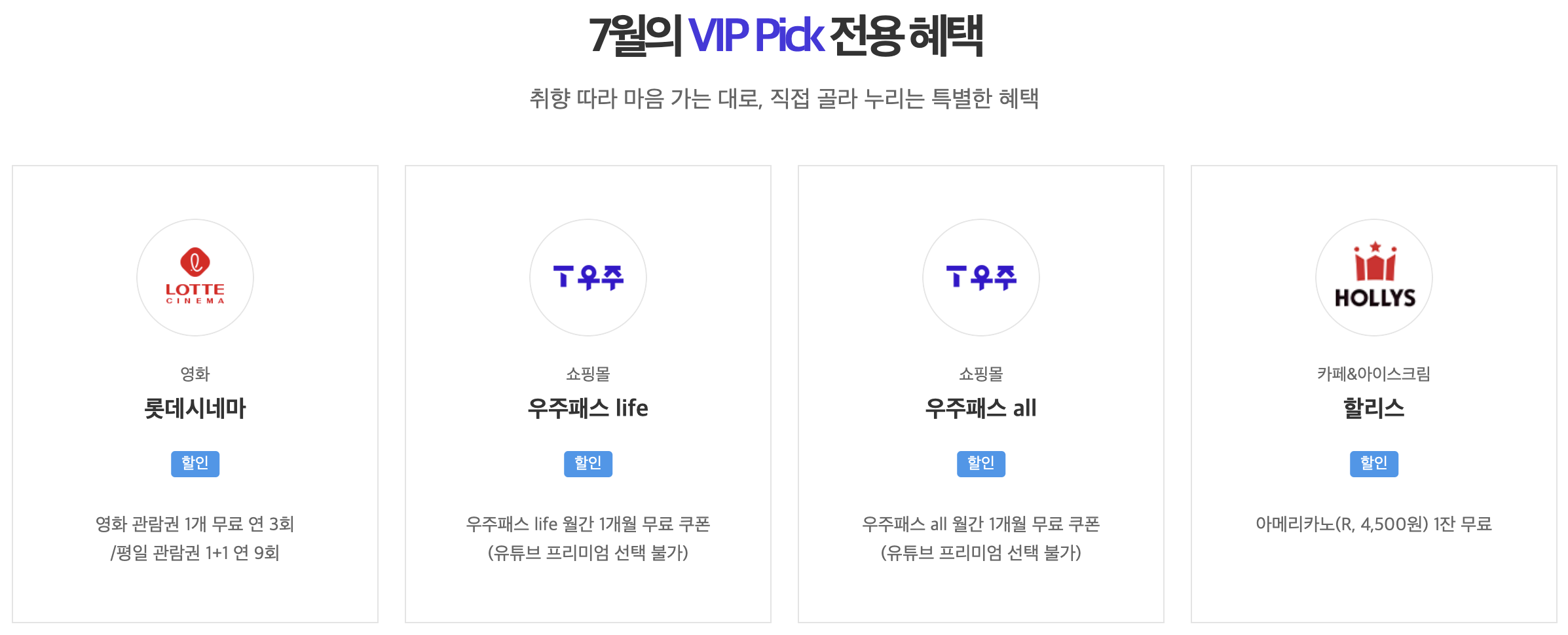 6월에 첫 가입이라 1천원에 유료로 이용하고, 6월 VIP Pick 쿠폰은 미리 선택 후 적용시켜놨더니 7월 결제일에 자동으로 쿠폰이 적용되어서 본격적으로 무료 이용을 시작하였습니다. 그나마 간만에 쓸만한 '혜택'을 발견해서 기분이 좋아지네요 ㅎㅎㅎ