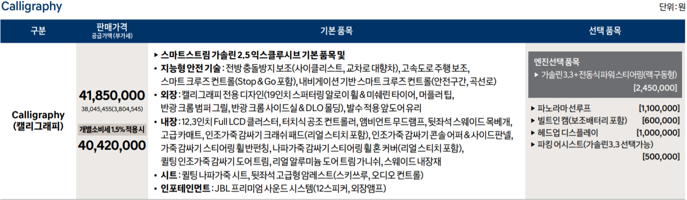 - 플래티넘: 12.3인치 Full LCD 클러스터, 앰비언트 무드램프, 터치식 공조 컨트롤러가 추가되어, 굳이 캘리그래피를 선택하지 않아도 됨