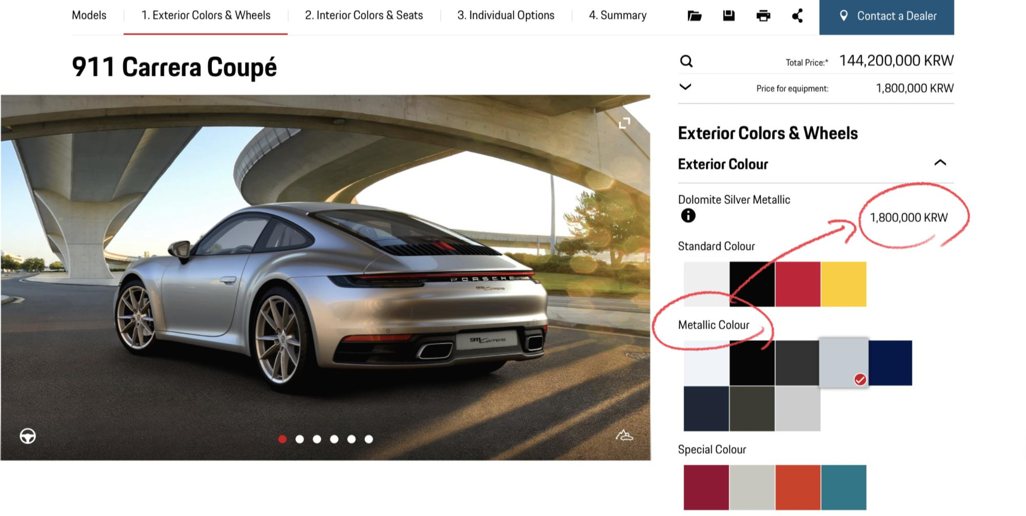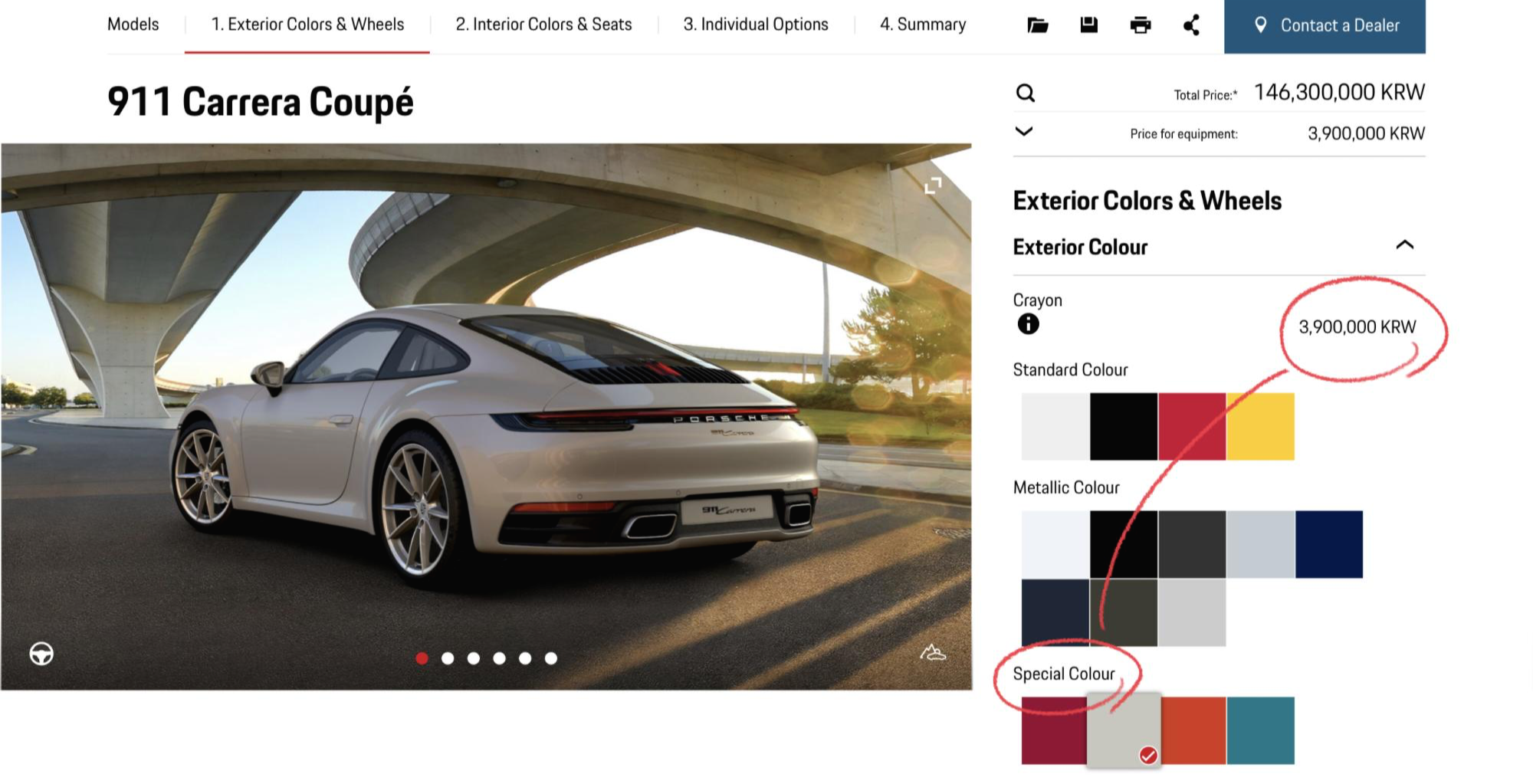 색상 선택에서부터 포르쉐 옵션가격에 무릎 꿇고 들어갑니다. 180만원이면 공업사에서 전체도색이나 괜찮은 랩핑도 할 수 있을 것 같습니다.