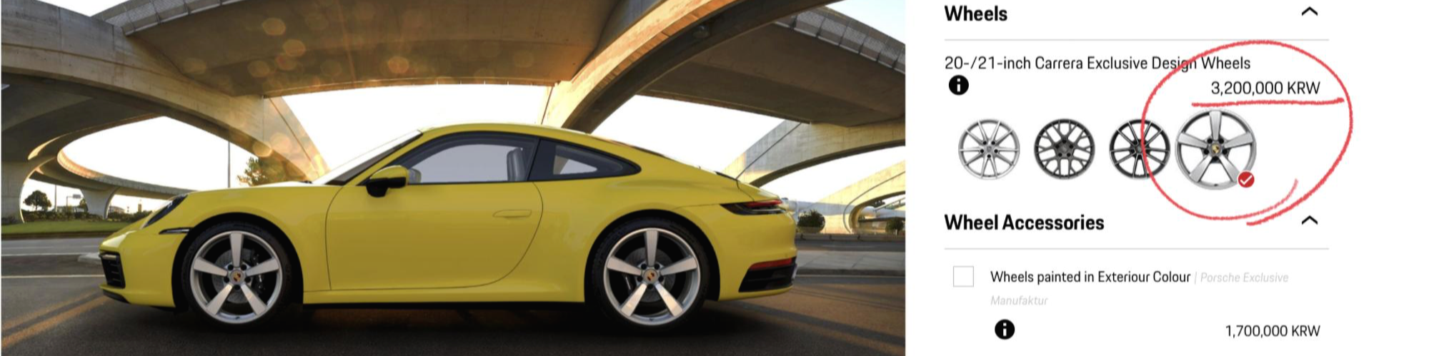 이어서 휠을 선택해봅니다. 제가 알아본 바로는 원래 Carrera는 앞19/뒤20인치 휠이 기본인데, 국내에서는 어찌된 일인지 앞20/뒤21인치인 Carrera S휠이 기본사양으로 만들어져 있습니다. 선택할 수 있는 휠들도 사이즈는 모두 동일합니다. 국내에서는 기본사양이지만 본래는 Carrera에서는 옵션이므로 저는 기본 적용된 사양을 그대로 두겠습니다.