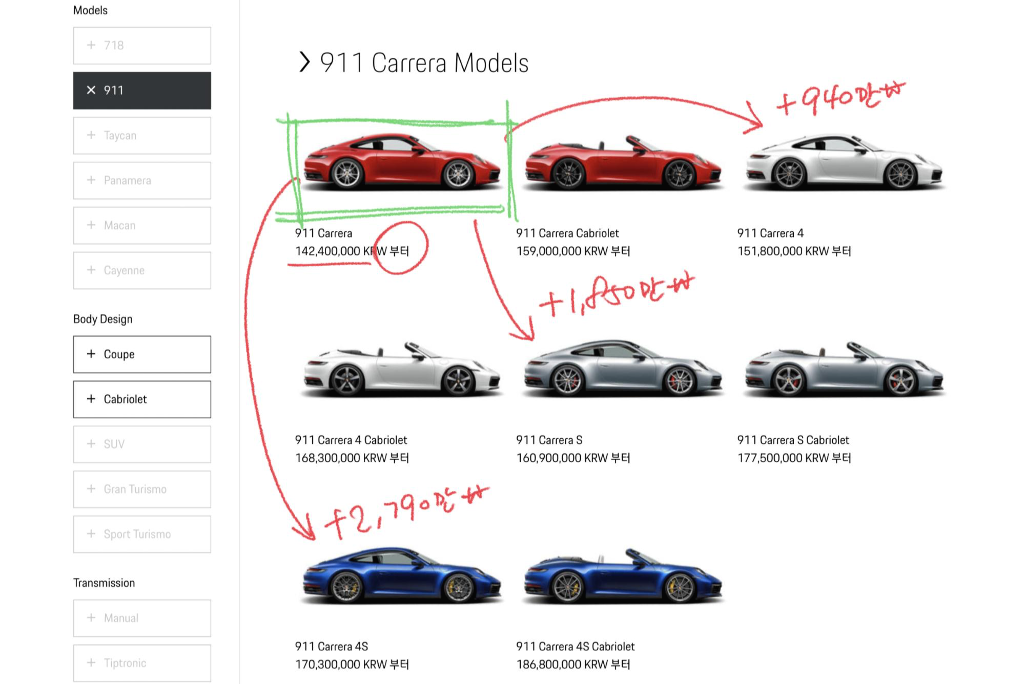 이번 Carrera S는 정말 훌륭한 차량이고, 이 이상 무엇이 필요할까 싶을 정도로 뛰어난 스포츠카입니다. S모델에 대한 많은 글과 시승기를 보면 당연히 S모델을 사야할 것만 같습니다. 그런데 막상 구매한다고 상상을 하며 구성하기를 시작해보니, 기본모델과 S모델의 가격차이가 무려 1,850만원이나 됩니다. 58마력의 추가 출력과 0.5초 단축된 제로백 성능의 가격 치고는 '저에게는' 너무 과하다는 생각이 듭니다. 또한 사륜구동이 적용된 모델의 가격을 보니, 사륜구동의 가격이 정확히 940만원 입니다. 21세기 전자식 사륜구동의 좋은점은 충분히 잘 알고 있지만, 지금도 후륜구동을 타고 있고 또 스포츠카는 후륜구동이어야 한다는 믿음을 가지고 있는 저는 '나의 8세대 911은 기본모델이면 충분하겠다!'는 결론을 내려봅니다.