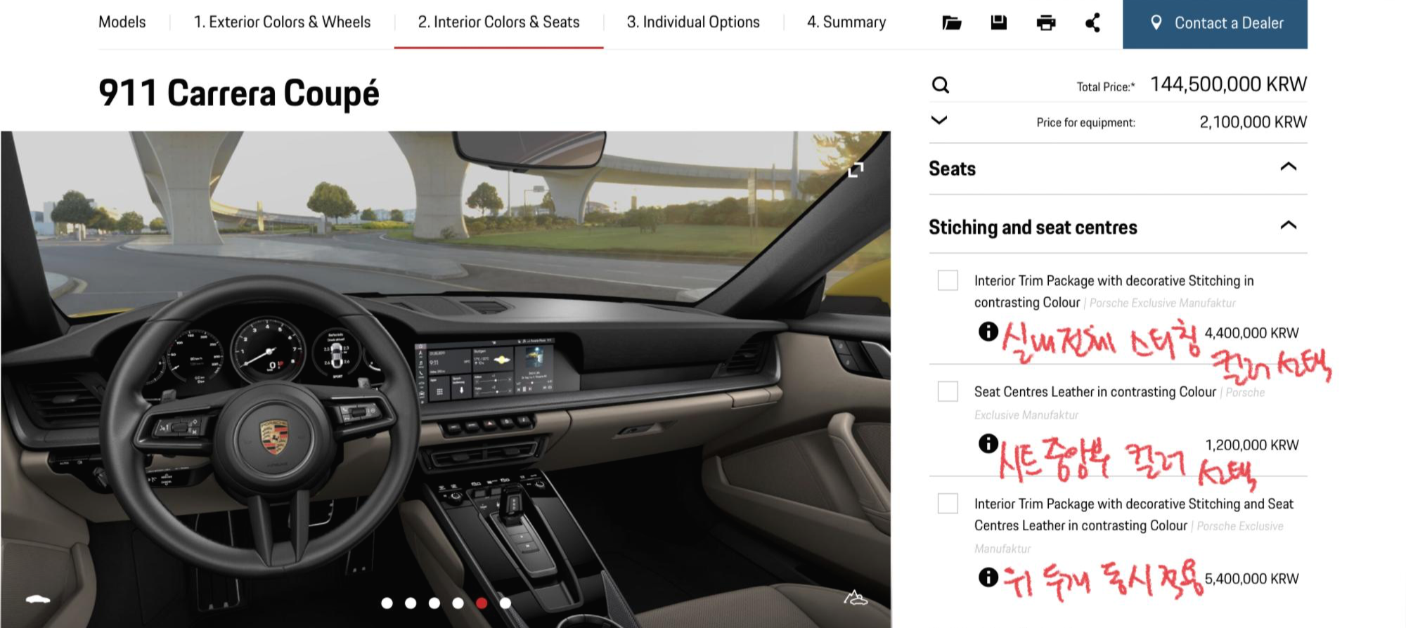이 외에도 시트에 관련된 꾸미기 옵션이 두 가지 등장하는데, 하나는 스티칭(440만원)이고, 다른 하나는 시트 중앙부위의 컬러 조합(120만원) 입니다. 두 개 다 하실거면 20만원을 깎아주겠다고 합니다. 그런데 저는 제 옷 중에도 100만원 넘는 옷이 하나도 없는데, 타고 다닐 차의 실밥에다가 수백 만원을 쓰고싶은 생각은 전혀 없어서, 이런 종류의 꾸미기 옵션은 과감히 생략합니다.