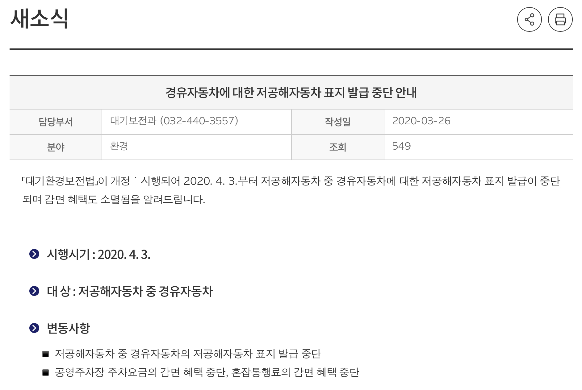 그런데, 며칠전 자동차 동호회 글들을 읽다가 한 회원이 올린 글에서, 공공기관에서 받은 우편물의 사진과 함께 저공해자동차로 인정받았던 차량에 대한 혜택이 사라지게 되었다는 내용을 접하였습니다. 제가 해당 글을 읽었을 때에는 그게 저공해차 스티커 발급을 중단한다는 것인지, 스티커 발급을 안하니까 혜택이 소멸된다는 것인지, 스티커 발급도 중단하지만 기존 혜택도 소멸된다는 것인지가 영 헷갈려서 관련 내용들을 이리저리 검색해보았습니다.