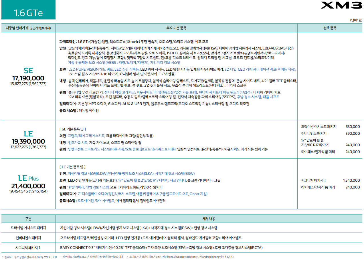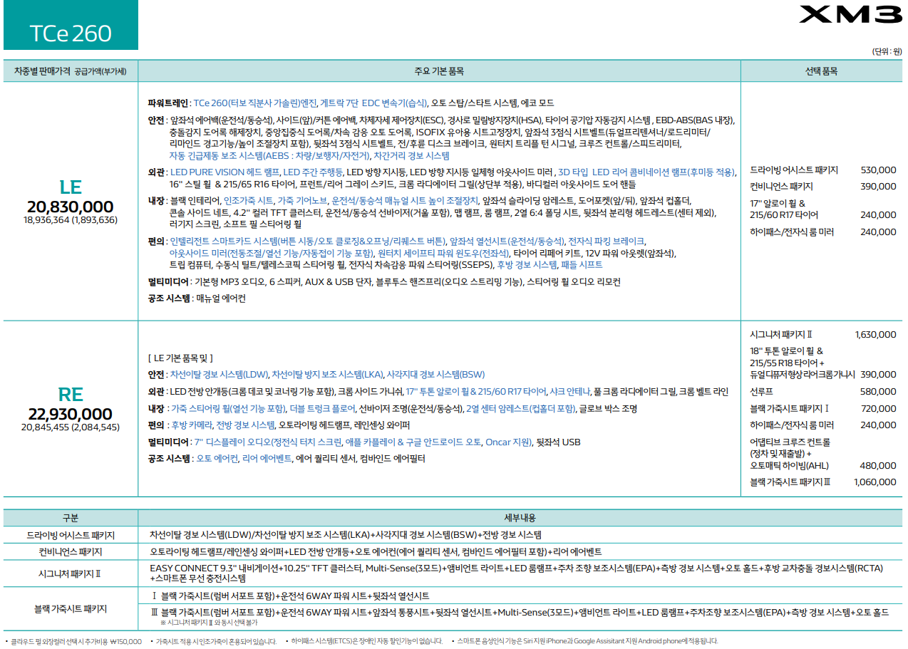 일단 여기까지는 꽤 맘에 드는 부분들이었는데, 막상 가격표를 열어보니 영 마음에 들지 않아서 포스팅을 작성하게 되었습니다. XM3는 두 가지 파워트레인을 제공합니다. 기본사양인 1.6 GTe는 1.6리터 자연흡기에 무단변속기 구성이고, 다임러와 르노가 같이 개발했다는 엔진은 TCe 260이라는 뱃지가 붙은 1.3리터 터보엔진에 게트락 7단 습식 듀얼클러치가 매칭됩니다. 문제(?)는 뛰어난 스타일은 국내 소비자들의 높아진 눈높이에 부합하고 있는데 반해, 이 파워트레인의 수치로 표현되는 성능은 그에 한참 뒤떨어집니다. 1.6 GTe의 최대출력은 123마력(6,000rpm)에 최대토크는 15.8kg·m(4,000rpm)에 불과합니다. 공차중량이 1,300kg대인 것을 감안하면 그냥 설렁설렁 타고다니기에는 특별히 부족할 것 같지는 않습니다만, 잘 달리게 생긴 생김새와는 너무 거리가 먼 실력입니다.