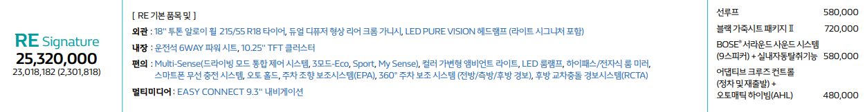 TEc 260 가격표를 찬찬히 살펴봐도 이런 점은 크게 다르지 않습니다. 기본형이 LE로 시작하여 RE, RE Signature까지 세 가지 등급으로 나뉘어지는데, 후방카메라가 필요하면 LE등급에도 여전히 옵션으로도 존재하지 않기 때문에 2,293만원짜리 RE 등급을 선택해야하고, 유일한 오디오 옵션인 Bose 오디오를 넣으려면 최고 등급인 RE Signature를 선택해야만 선택할 수 있는 기회가 주어집니다.