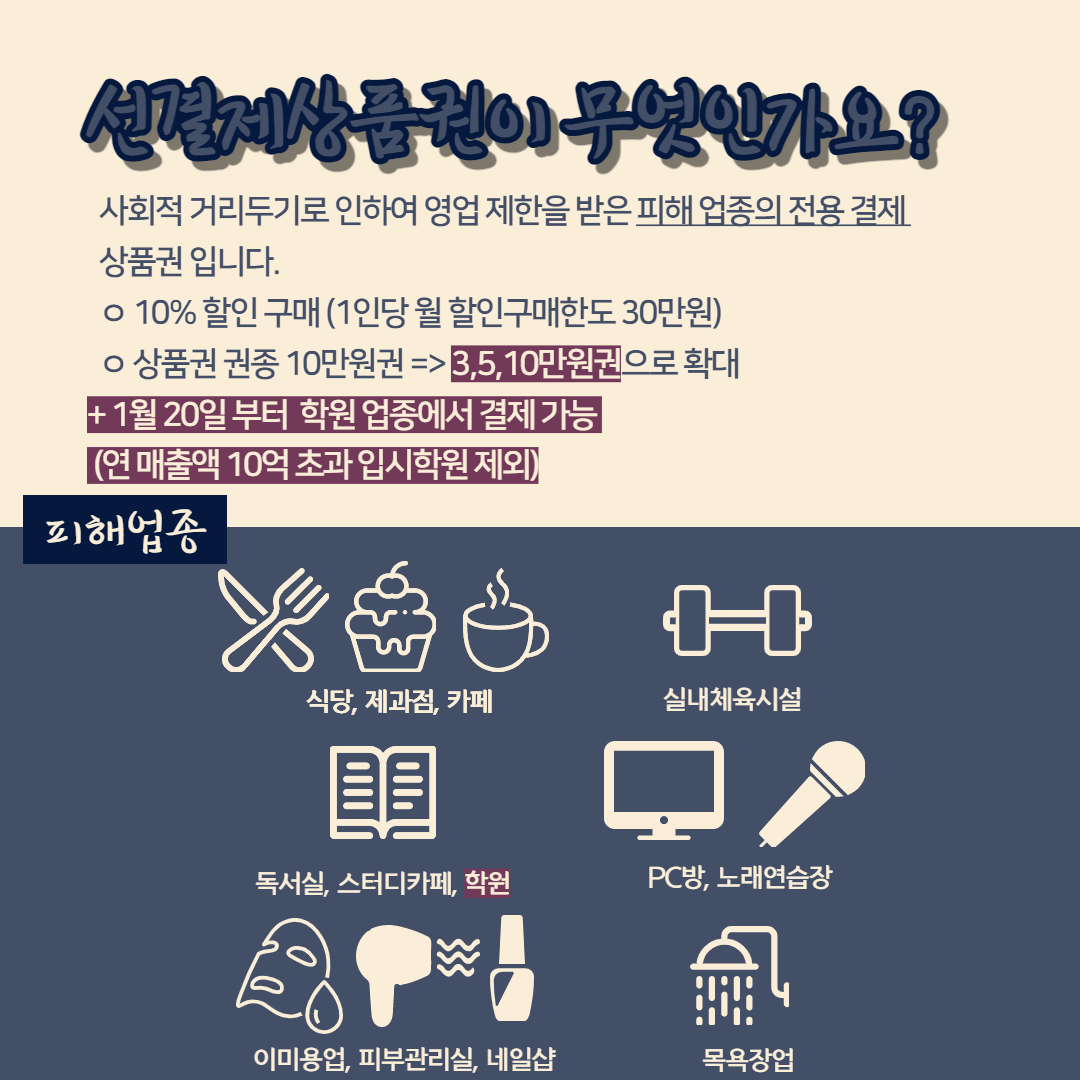 작년 한 해 동안 코로나로 너무 힘들었던 많은 자영업자 분들을 지원하고자 서울시에서는 2020년 말에 선결제 상품권을 추가로 선보였습니다. 다만 저는 이번엔 구매를 하지 않았었습니다. 이유는 1. 제가 쏠쏠하게 잘 써먹었던 대표 업종 중 하나인 '학원'이 대상 업종이 아니라는 점과 2. 유효 기간이 2021년 1월 말일 까지로 매우 짧기 때문이었습니다.