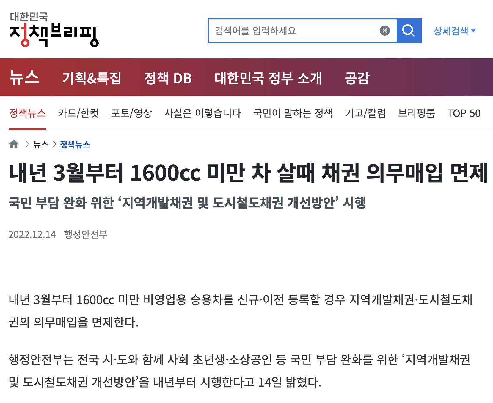 오늘은 무슨 뉴스가 있었나~ 하고 잠들기 전에 기사들 둘러보다가 흥미로운 기사를 발견했습니다. 내년(2023년) 3월부터 1,600cc 미만 차 살때 채권 의무매입 면제 라고 하네요?!