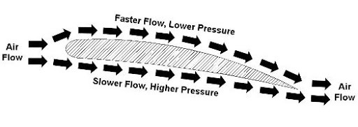 영문 자료를 많이 검색해보니, 답은 결국 '날개'라는데에 있었습니다. 날개 면 위에 엔진이나 다른 구조물이 붙은 비행기를 본 적이 있으신가요? 날개 달린 비행기가 공중에 뜰 수 있는 원리는 바로 날개 위쪽에 형성되는 압력이 아래쪽보다 낮기 때문입니다. 날개의 단면은 아래 그림에서 보시는 것처럼 위가 불룩하고 아래는 평평한데, 쉽게 말해서 앞에서 갈라진 공기가 뒤쪽에서 다시 만나기 위해서는 불룩한 면의 공기는 평평한 면의 공기보다 빨리 흘러가야하다보니 압력이 낮아지게 되는 것이죠. 그러면 날개는 떠오릅니다. (=양력)