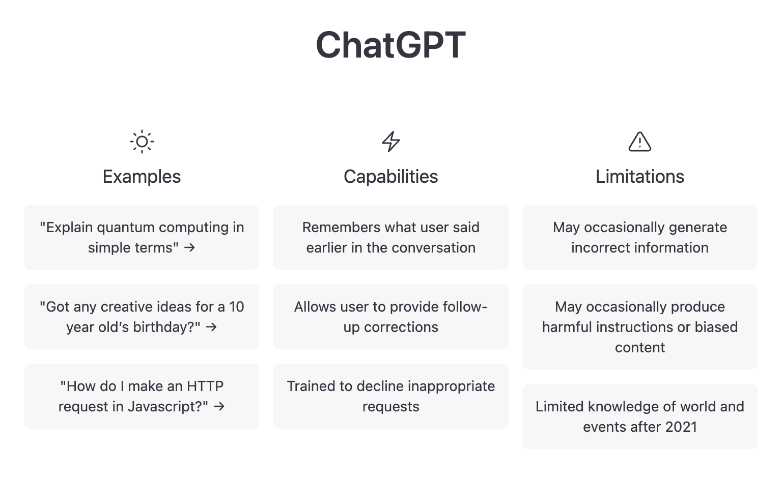 - Limitations: Despite its impressive performance, ChatGPT still has limitations. For example, it can sometimes generate biased or offensive responses, reflecting the biases present in its training data. Additionally, it can sometimes generate nonsensical responses, particularly when it is presented with an input that is out of its scope of knowledge.