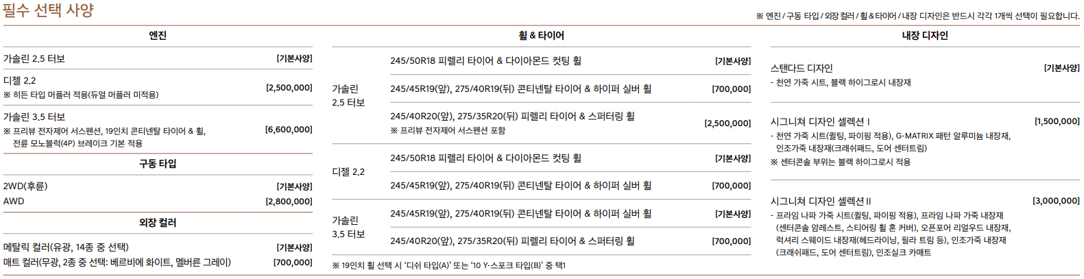 필수 선택사양을 몇 가지 살펴보면, 3.5 터보의 가격이 GV80는 550만원 이었던데 반해 G80에서는 660만원 입니다. 프리뷰 전자제어 서스펜션이 G80에서는 110만원 짜리 옵션인데, 3.5터보의 가격차가 딱 110만원인 것을 보면 끼워팔기 아닌가...하는 의심이 살짝 듭니다. GV80에서는 3.5터보의 기본 휠이 20인치인데 G80에서는 19인치입니다. 다만, GV80는 휠이 19/20/22인치로 제공되지만 G80는 18/19/20인치로 제공되기 때문에 그러려니 하겠습니다.