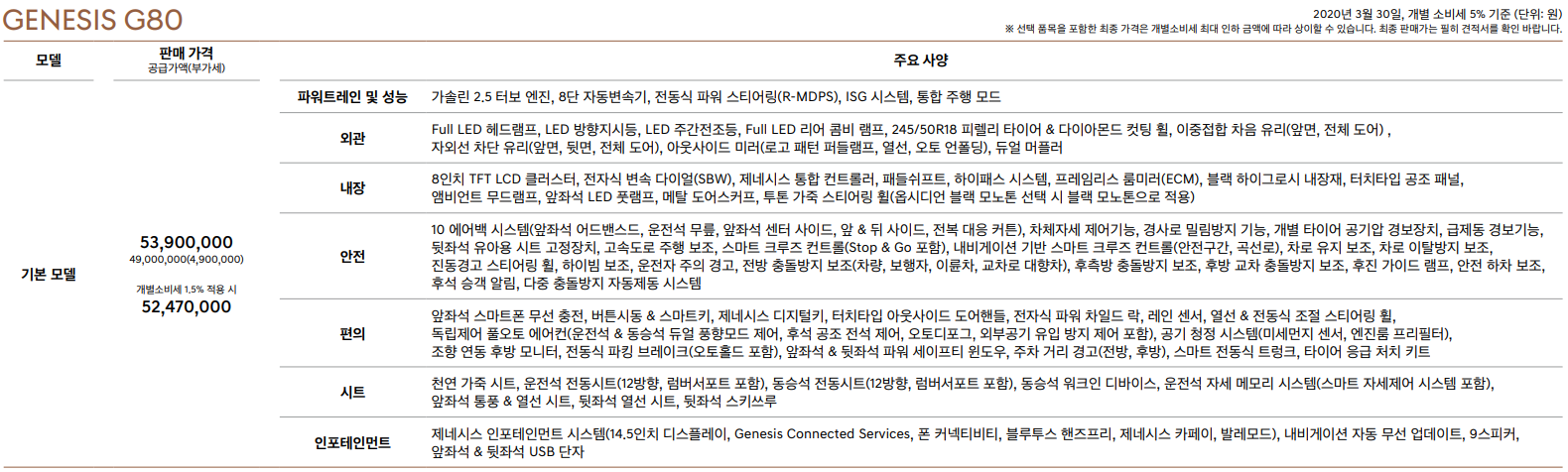 이전에 GV80 가격표를 살펴보았을 때(이전 글 읽기)도 그랬지만, 오늘 G80 가격표를 살펴보면서도 똑같이 드는 생각은 '이게 다 기본 사양이라니?!'라는 것입니다. 상당히 다양한 편의 및 안전사양들이 이미 포함되어 있기 때문에, 최신 기술이나 화려한 내/외장에 딱히 관심이 없는 분들은 그냥 기본형을 선택해도 무난한 선택이 될 듯합니다.