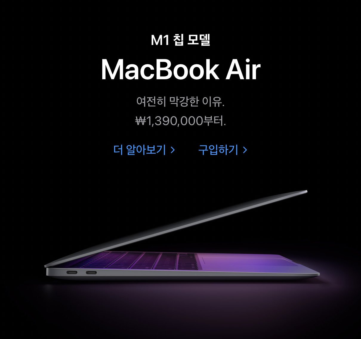 반면에, 맥북 에어를 선택하는 몇몇 이유 중 하나로 팬리스 구조(=무소음)를 꼽는 경우도 많던데, 그 얘기인 즉슨, 팬이 돌아야 할 만큼의 일은 하지 않을 것 같다는 뜻으로도 해석할 수 있을거고요. 그렇다면 M2 칩을 장착한 맥북 에어가 자랑하는 퍼포먼스가 '맥북 에어'에서 정말 필요한가 싶기도 합니다. 그래서인지, 애플 홈페이지 안에서도 M1 칩을 장착한 맥북 에어에 대해 '여전히 막강한' 이라는 표현을 현재 쓰고 있습니다.