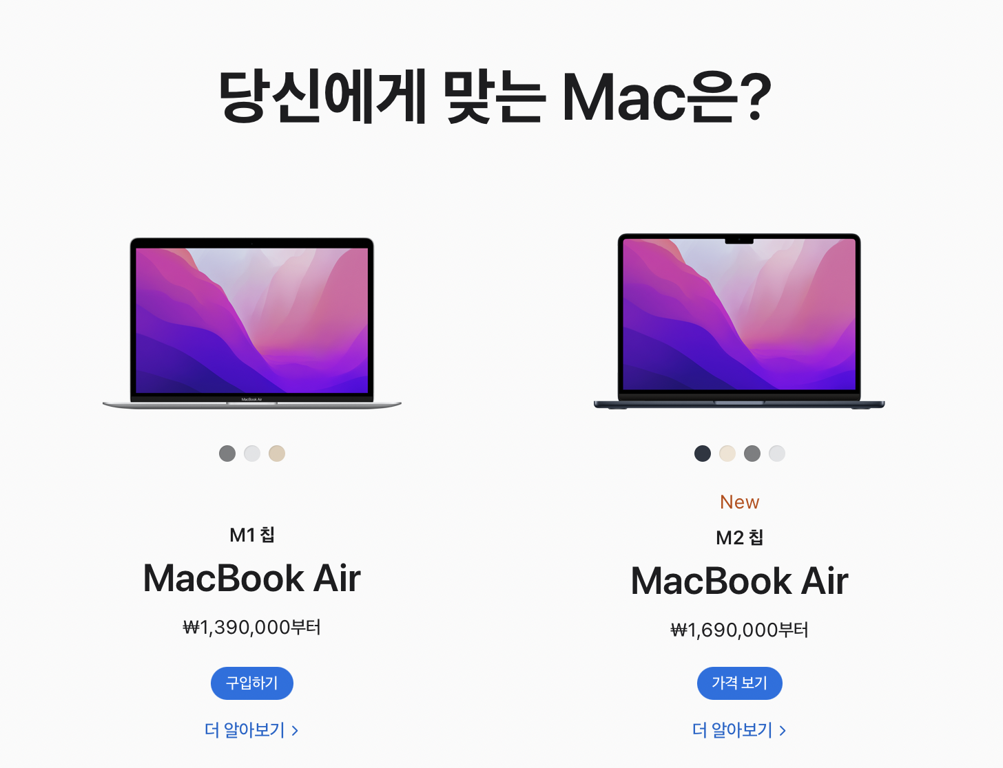 그런 M1 칩 장착 맥북의 감동이 완전히 가시기도 전에 지난 6월 6일 시작된 애플 WWDC에서 M2가 발표 되었네요?! M2가 가장 먼저 장착될 새로운 컴퓨터는 맥북 에어와 맥북 프로 13 이라고 합니다. 그 중 맥북 에어의 경우에는 당분간 M1과 M2 모델이 함께 판매가 되는 것으로 보입니다. 애플 홈페이지에서 확인해 보시면 두 모델이 함께 가격과 제원이 나와있죠. 여기서 어려운 문제가 생깁니다.. 이 시점에서 과연 둘 중 무엇을 사야하느냐??